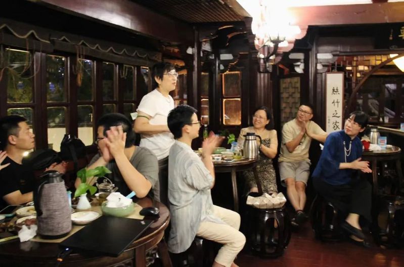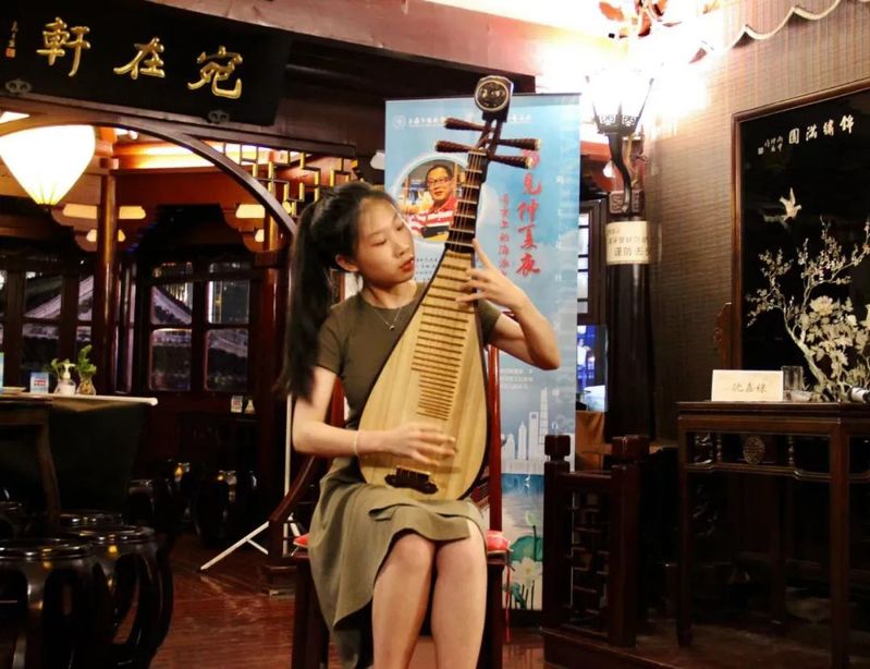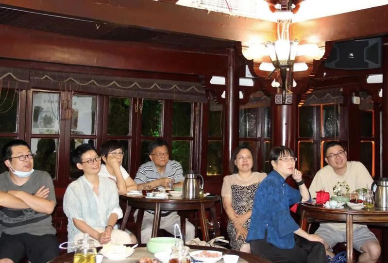 九曲桥畔的美景令人陶醉,湖心亭内的欢笑此起彼伏。讲座结束后,17戏音班的张竞闻同学奏乐助兴,为大家带来琵琶独奏《出水莲》,但闻转轴拨弦,轻栊慢捻,大弦嘈嘈,小弦切切。似见涟漪轻泛,新荷出水,凉意顿生。而面对满屏的佳肴珍馐,老师们一时间都觉得意犹未尽,上海特色美味接龙游戏即兴登场:乔家栅擂沙圆、沈大成两面黄、大壶春生煎包、郑福斋酸梅汤、稻香村鸭胗肝、大富贵臭鳜鱼、老饭店草头圈子……众人纷纷拾起童年回忆,桌桌竞相晒出沪上美味。聊着聊着,大家热切企盼下次活动可以从“纸上谈兵”,直接上升到“实战演习”,阿拉必须搞一趟“海派美食品鉴会”!