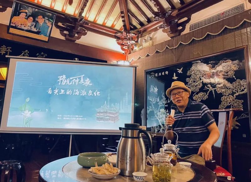 移步二楼宛在轩,当晚的海派美食文化沙龙正式开启。享有“文坛美食家”之称的沈嘉禄老师,系中国作协、上海作协理事,小说专委会主任,原上海报业集团高级记者。他专注于研究上海城市文化、上海近代史及市民社会生态,涉及“非遗”保护与传承等领域。沈老师从海派美食文化的起源、形成、发展,以及未来走向娓娓道来,如数家珍,引人入胜。
