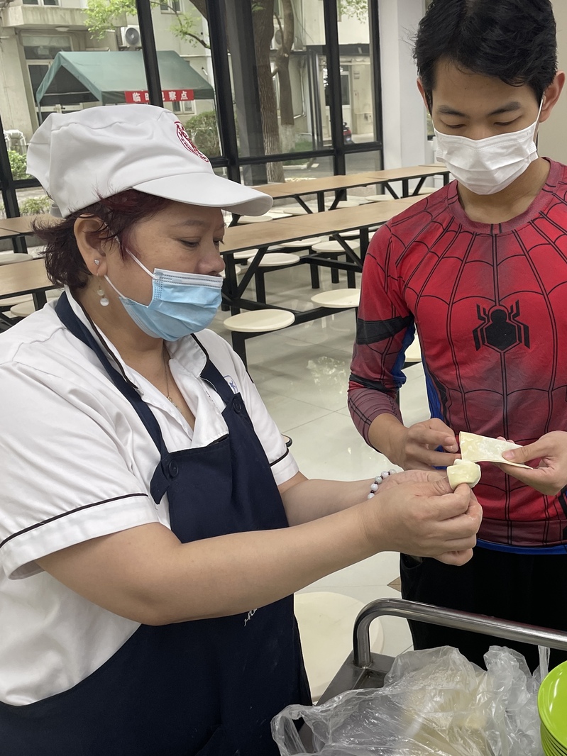 上午十点,食堂的叔叔阿姨们已经为大家准备好了饺子皮、饺子馅等各种材料和工具,同学们有模有样的学着叔叔阿姨的手法开始包起来。面对同学们生涩的动作,食堂叔叔阿姨们耐心地进行手把手的教学,同学们很快便领悟了精髓所在,手法逐渐熟练起来,放馅、合拢、捏褶,一套套动作行云流水,一盘盘饺子饱满诱人。没过多久,像小船、像元宝、像糖果的饺子逐渐在同学们的手里成型,一个个独具特色的饺子,很快就摆满了盘子。大家看着自己包出来的饺子,脸上洋溢着兴奋与自豪,整个过程大家都忙得不亦乐乎。