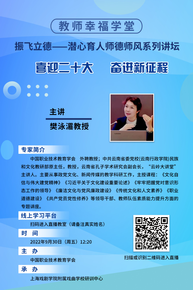 为深入贯彻习近平总书记关于职业教育的重要指示,落实《中华人民共和国职业教育法》精神,扎实推进学校师德师风建设,激励全体教师在工作中立足本职、师德为先,弘扬和践行“爱岗敬业、教书育人、为人师表”的精神,打造一支道德高尚、业务精良的教师队伍,形成全员育人、全程育人、全方位育人的良好氛围。9月30日下午,我校与中国职业技术教育学会联合共同举办开云足球首页官网下载附属戏曲学校2022年度“振飞立德—潜心育人”师德素养专题学习活动。本次活动由中共云南省委党校(云南行政学院)教授、云南省孔子学术研究会副会长、“云岭大讲堂”主讲人樊泳湄教授作题为《喜迎二十大,奋进新征程》专题讲座。