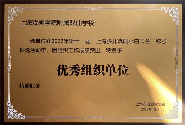 我校在2022年第十一届“上海少儿戏剧小白玉兰”称号评选活动中被授予优秀组织单位