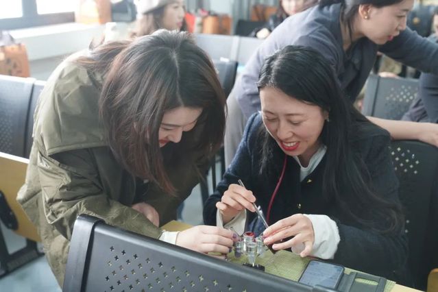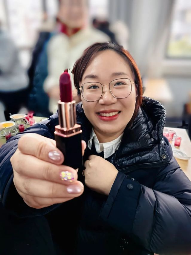 在制作过程中,大家全身心投入,将日常工作中的严谨细致融入到每一个动作里。脱模时,最考验人的耐心与技巧。有的老师凭借着平日里处理工作难题的果断与自信,手法娴熟,一次成功;有的老师则如批改作业时那般认真仔细,即便遇到口红硬度不够的小状况,也不慌不忙,反复尝试,直至手中诞生那支独一无二的口红。她们专注的神情、坚定的眼神,展现出老师们坚韧不拔、精益求精的品格。