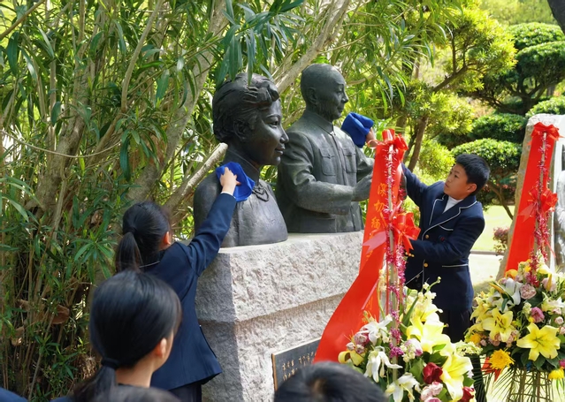 接着,学生代表杨思城、姜涵梓分别拿出早已叠成四方的绒布,细致地擦拭雕像的每一处。轻轻拭去的不仅是尘埃,更是时光的隔阂;细细摩挲的不仅是碑石,更是永恒的历史丰碑。