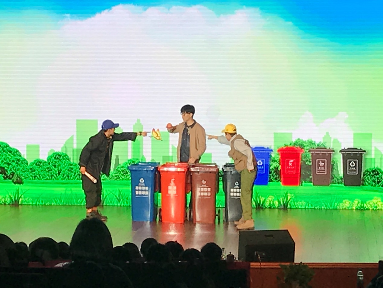 导演系学生的《垃圾分类我先行》由创业青年与家人之间的误会故事展开,通过垃圾分类这一创业点,展现了年轻人良好的品质,赢得了家人的赞赏。小品聚焦当下社会热点,将垃圾分类的观念和小知识融入其中,赢得了台下观众阵阵笑声和掌声