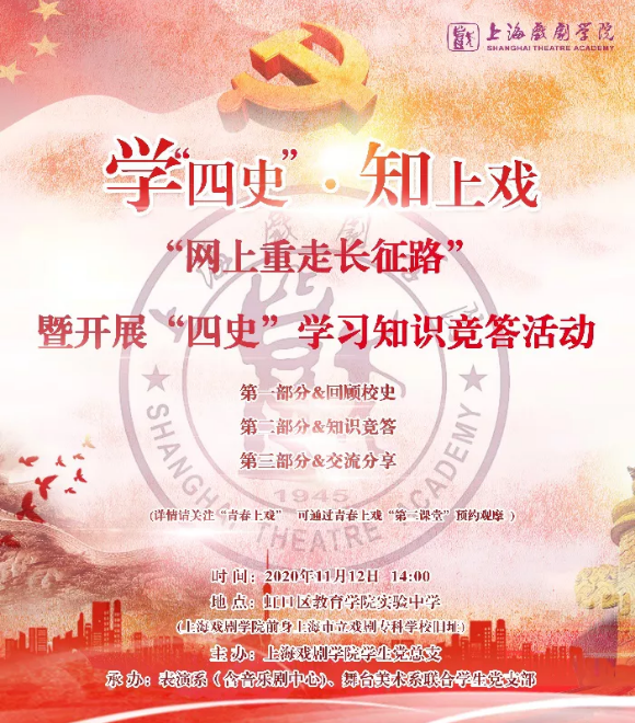今年12月,上海戏剧学院将迎来75周年校庆,为推动全国各高校师生学习“党史、新中国史、改革开放史、社会主义发展史”,走好新时代的长征路,上戏于11月13日组织党训班的同学们进行了学“四史”˙知上戏 “网上重走长征路”暨“四史”学习知识竞答活动。通过学习党史和新中国史,结合上戏的校史,让同学们对这些光辉历史有了更深的体会,更加深刻地意识到自己身上所肩负的弘扬传统文化,建设社会主义文化强国的责任和使命。