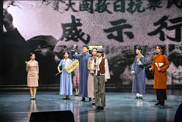 在上海学子纪念“一二九”运动85周年主题集会中,上戏学子则创排了《海上星火》。