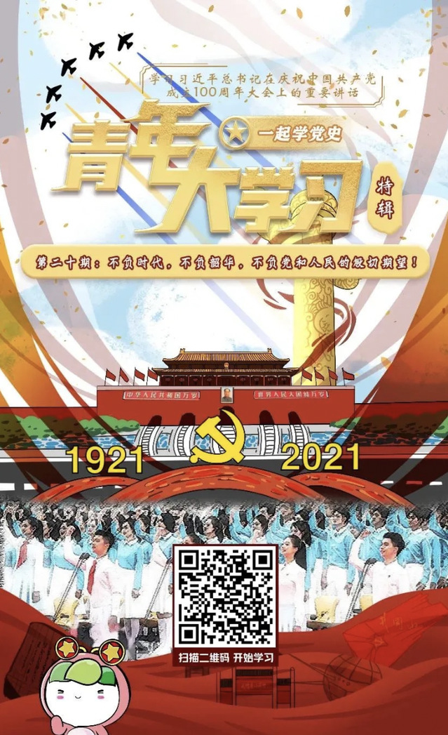 “7月1日,庆祝中国共产党成立100周年大会在北京隆重举行,习近平总书记发表重要讲话。在讲话即将结束的时候,总书记深情讲道:新时代的中国青年要以实现中华民族伟大复兴为己任,增强做中国人的志气、骨气、底气,不负时代,不负韶华,不负党和人民的殷切期望!