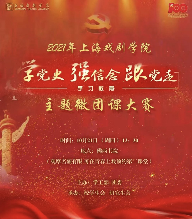 为深入学习贯彻习近平总书记“七一”重要讲话精神,10月21日下午,由上海戏剧学院学工部、团委主办,校学生会、研究生会承办的“学党史、强信念、跟党走”主题微团课大赛在我校昌林路校区佛西书院顺利举办。