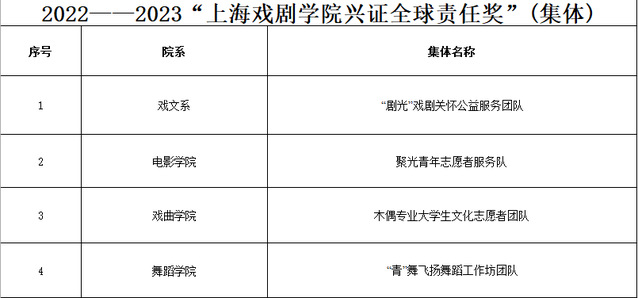 根据《上海戏剧学院兴证全球责任奖评定办法》的有关规定,经过学生自我推荐、院系推荐、学校审核,以下4个集体和7名个人获评2022-2023年度兴证全球责任奖,具体简介附后。