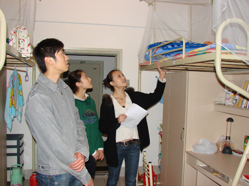 2008年3月20日中午,我院学生自治委员会成员在学院专职辅导员周欢、兼职副导员邢桑老师的带领下,对我院同学的公寓卫生状况进行了检查。由于检查前期所了充分的动员工作,检查过程中同学们都能积极配合,我院学生公寓卫生状况大体良好,不存在违章用电的现象,对于个别较乱的学生公寓,我们进行了教育,并限期整改。