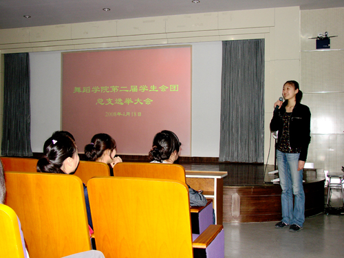 2008年4月18日中午11:30,开云足球首页官网下载舞蹈学院学生会团总支选举大会在莲花路校区图书馆一楼报告厅举行,本次会议由舞蹈学院专职辅导员主持,本次选举与会学生代表80人,竞选人演讲、学生代表投票、票务统计、公布票选结果四个环节,从10名候选人当中,脱颖而出了6名候选人。