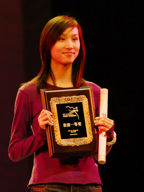 图为:《龙飞凤舞-鼓》演员代表闵燕领奖