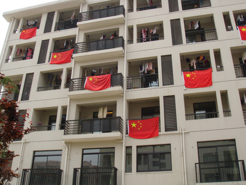 图为:宿舍楼上悬挂的国旗