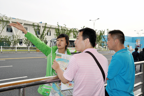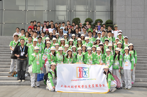 图为:我校学生党员服务队成员与园区志愿者在世博演艺中心前的合影