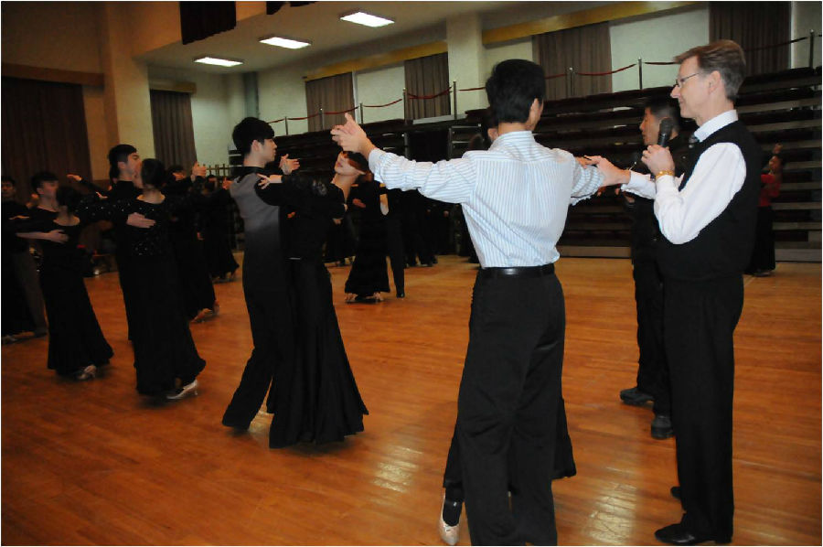 图为:七届英国黑池世界摩登舞冠军Marcus Hilton正在授课