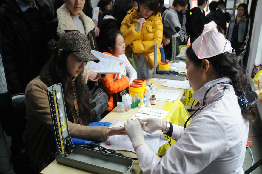 图为:我院学生参加献血前的验血检查