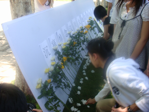图为:同学向纪念墙献花