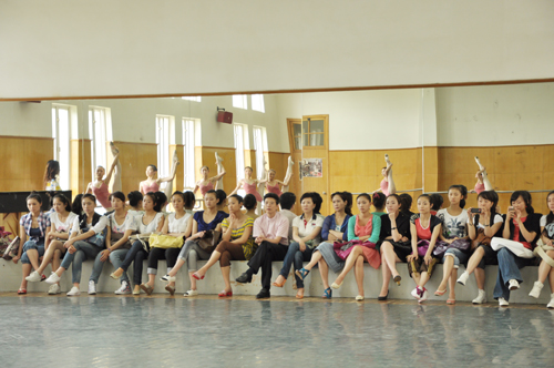 图为:客人们正在观摩我院课堂教学(民间舞)