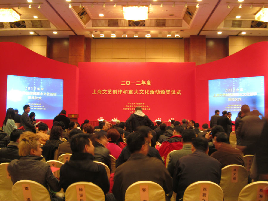 2012年度上海文艺创作精品、优品和文艺家荣誉奖颁奖活动于上午9点半在锦江小礼堂准时举行。奖项分为五大类,分别为上海文艺创作精品奖、上海文艺创作优品奖、上海文艺创作优秀单项成果奖、上海文艺家终身荣誉奖、上海2012年度优秀文艺工作者奖。上海文艺界的各路优秀骨干汇聚一堂,颁奖活动由上海市委宣传部副部长陈东主持。