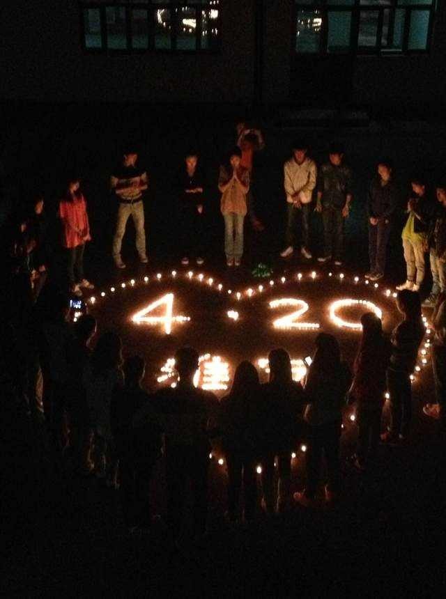 图为:2013年4月26日晚同学们为雅安灾区人民祈福