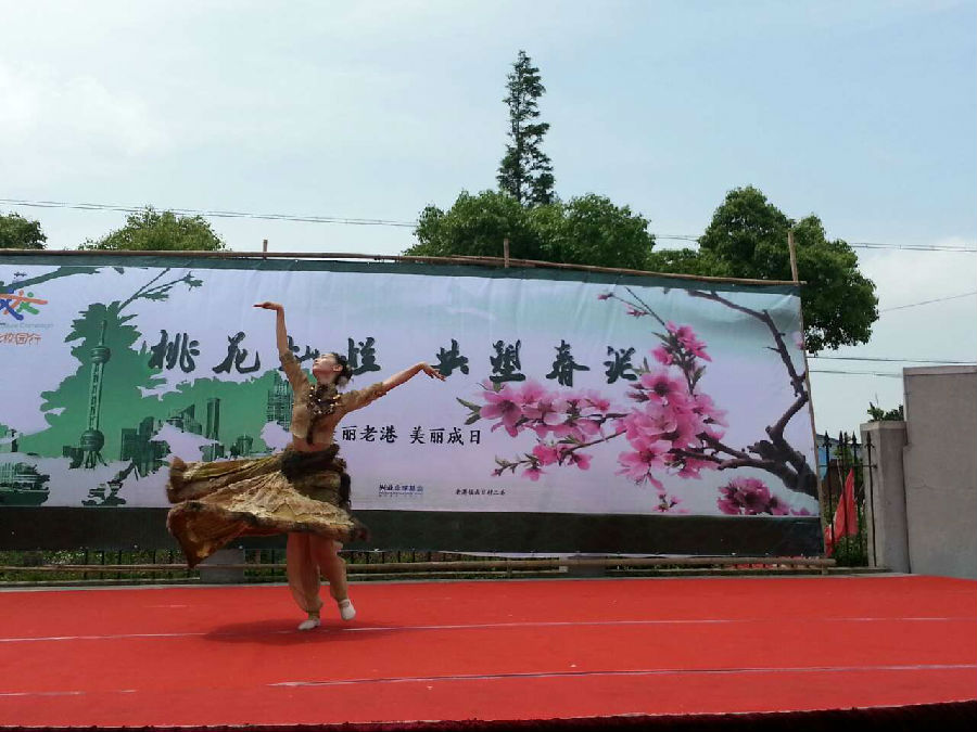 5月31日,在端午节即将到来之际,我院民间舞学生带着三个富有特色的剧目:“画伞幽兰”、“羚之风情”、“我和我”,在孙秋红书记、丁奇睿老师的带领下,随开云足球首页官网下载党委副书记胡敏老师和其他院系师生一起来到了浦东新区老港镇成日村,冒着高温,在露天舞台上为当地村民演出,受到父老乡亲的热烈欢迎。