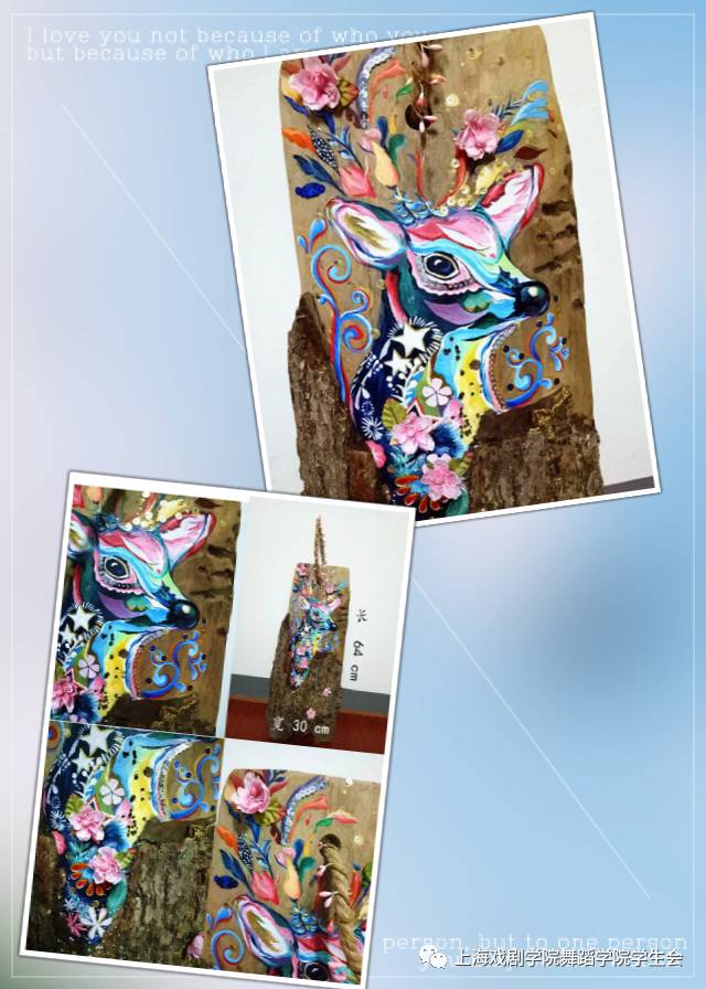 作品简介:以枯木断木的树皮作为二次利用画板,绘画出一只林间麋鹿,一只富有想象力的七彩花鹿,并加上花和亮片,就如林中出水沐浴的彩鹿。将一个枯木树皮再次变成一个装饰品,也是艺术品。