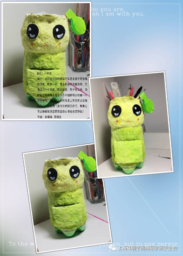 作品简介:这颗因为长得像菜的菜是主要由可乐瓶、餐巾纸、购物小票和食品包装纸盒做成的。它相当于一个笔筒,可以插笔、尺子等各种文具。同时它的身体上开了一个小抽屉可以收纳一些小小物件。把它放在你的书桌上不仅可以装饰而且它是绿色的,当你工作了很久时,看看它可以缓解视觉疲劳并且给你的书桌增添一抹清新的绿色。