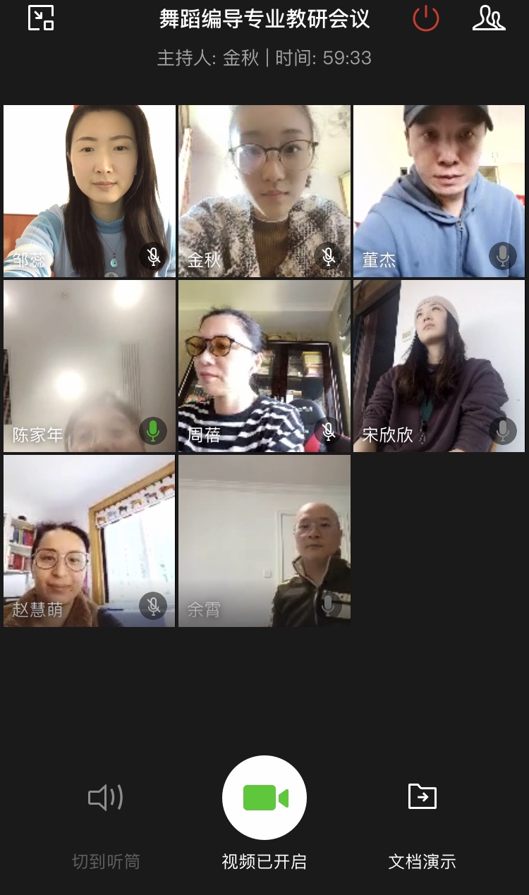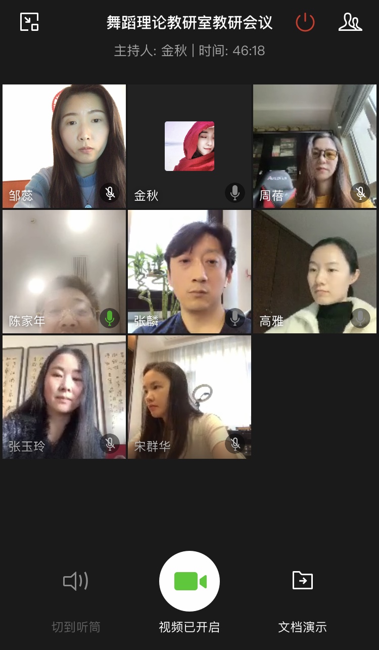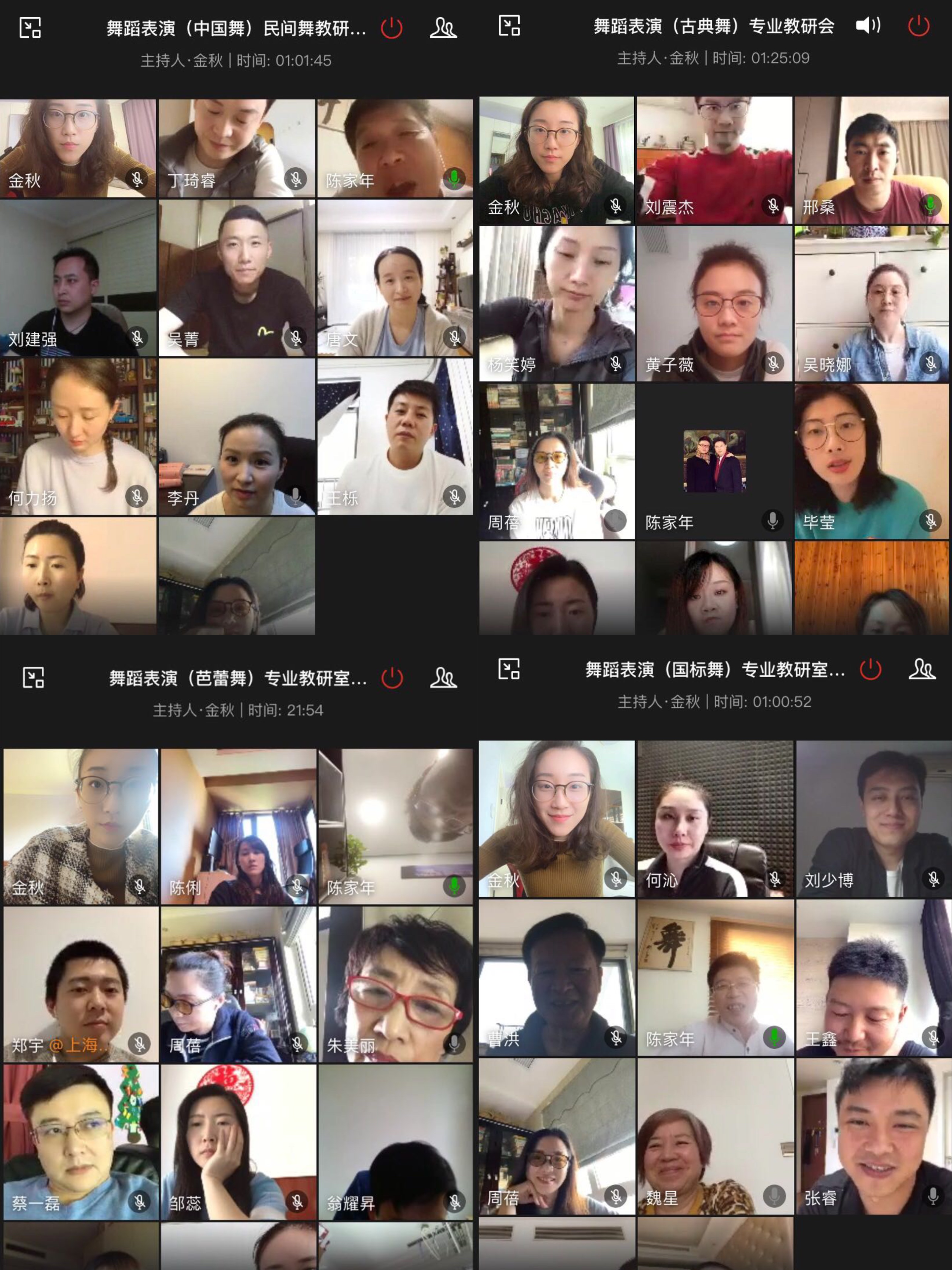 自二月初筹备至三月二日开学以来,线上教学工作按照教学计划稳步推进十周。列入舞蹈学院整体工作部署计划的线上教学研究、教学总结会议也如期召开。会议由各教研室主任主持,每位任课教师就所教授的课程情况进行了汇报,针对教学中出现的问题进行分析并讨论解决方案,同时对未来八周的教学和考试方案进行探讨和梳理。舞蹈学院院长陈家年、副院长周蓓全程参与了各教研室专业会议,对各教研室的工作给予了指导意见。