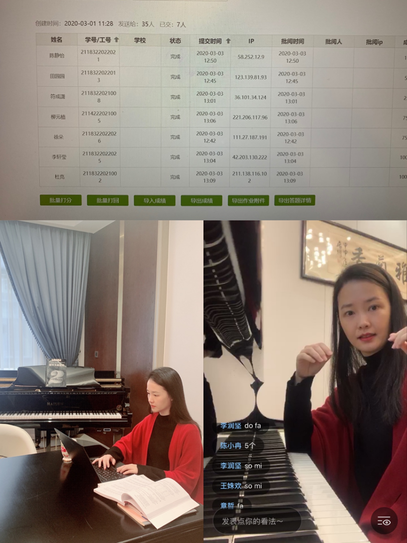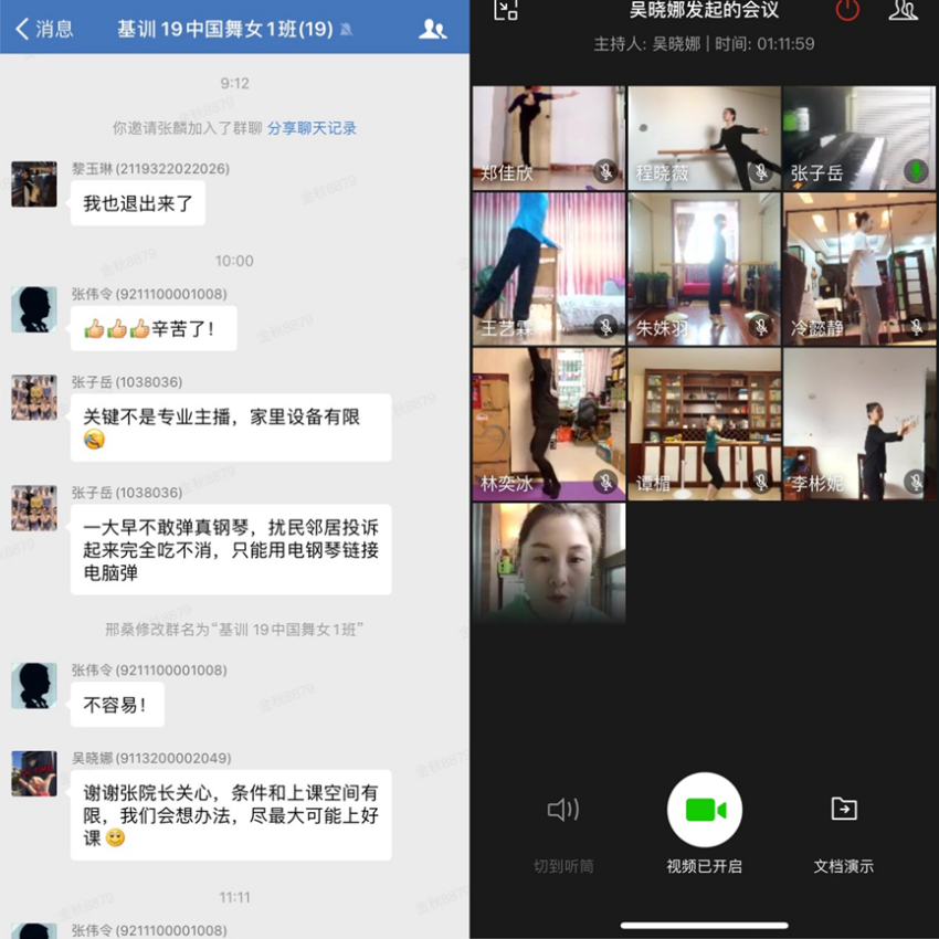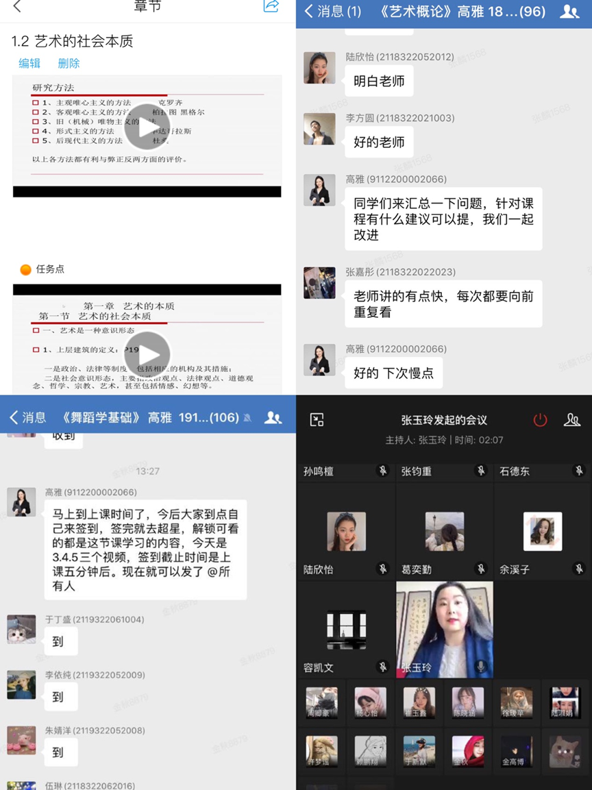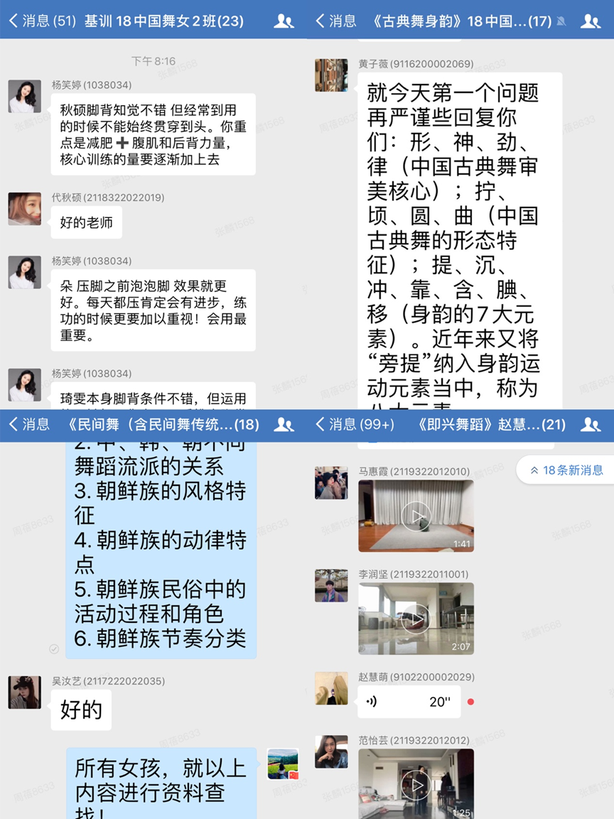 舞蹈理论教研室的教师们则结合超星平台和微信群进行同步授课,使得学生在学习理论课视频的时候,既能保持与教师之间的即时互动,又能及时了解学生的学习情况并进行问题的解答。为了让理论知识变得更直观易懂,教师还在乐理课程中直接上琴演示帮助学生进行学习。此外,理论课教师主动增加线下辅导,注重引导学生在特殊时期集中阅读舞蹈专著以加强学生的舞蹈艺术综合素养。