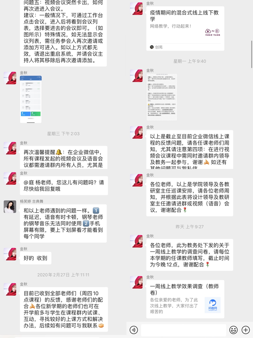 线上教学课堂的顺利推进也离不开学院办公室老师们的协助。教务秘书及时发布各类信息与文件、协助任课老师们进行线上教学平台的操作学习,积极跟进每一堂课,对于收集的问题进行反馈,助力线上课堂教学按时顺利开展。