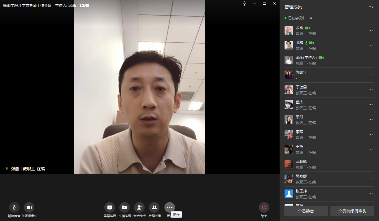 舞蹈学院研究生导师开学准备工作会议于9月3日13:30在企业微信通过在线视频会议方式顺利召开。会议由研究生工作负责人张麟副院长主持,舞蹈学院全体导师积极准时参会,共同就“习近平总书记关于研究生教育的重要指示精神”进行深入学习,对进一步加强研究生日常教学管理规范化及优化课程设置多样性和合理性、严格把关研究生学位论文和毕业作品进度和质量等进行多方讨论和思考。