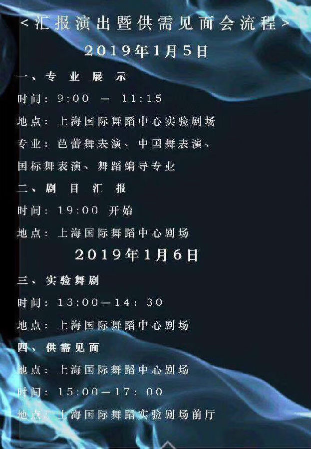 本次汇报演出暨供需见面会包括专业展示、剧目汇报、实验舞剧和供需见面四大板块,分别于1月5日上午、晚间,1月6日下午开展。具体流程安排如下: