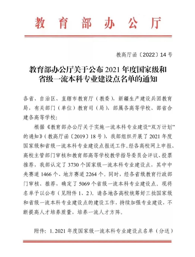 近日,教育部办公厅公布了2021年度国家级一流本科专业建设店名单,我院舞蹈编导专业入选其中,这也是我院继2020年舞蹈表演专业入选国家级一流本科专业后再度入选,实现了舞蹈学院一流本科专业建设点占比100%的傲人成绩。
