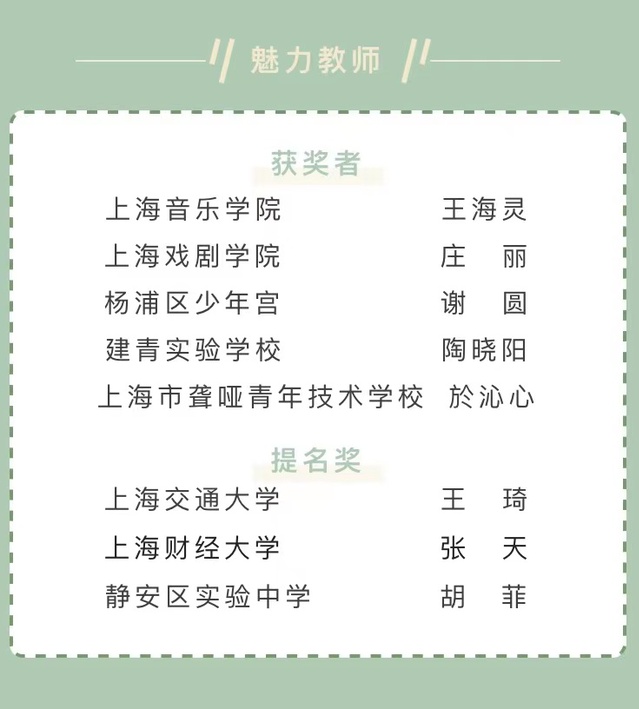 经学校推荐,区级评审,上海市艺术教育委员会终评,共评选出“魅力校长”、 “魅力教师”、“魅力学生”、“魅力活动”若干荣誉称号。