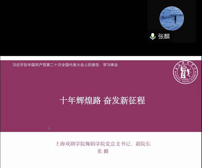 20221229日,舞蹈学院党总支开展了专题学习,本次学习活动将党员组织生活扩大至全院教职工层面开展,结合教职工理论学习进行,学习会由党总支副书记徐辉主持,党总支书记张麟讲授党课,主题为:“十年辉煌路,奋发新征程”。