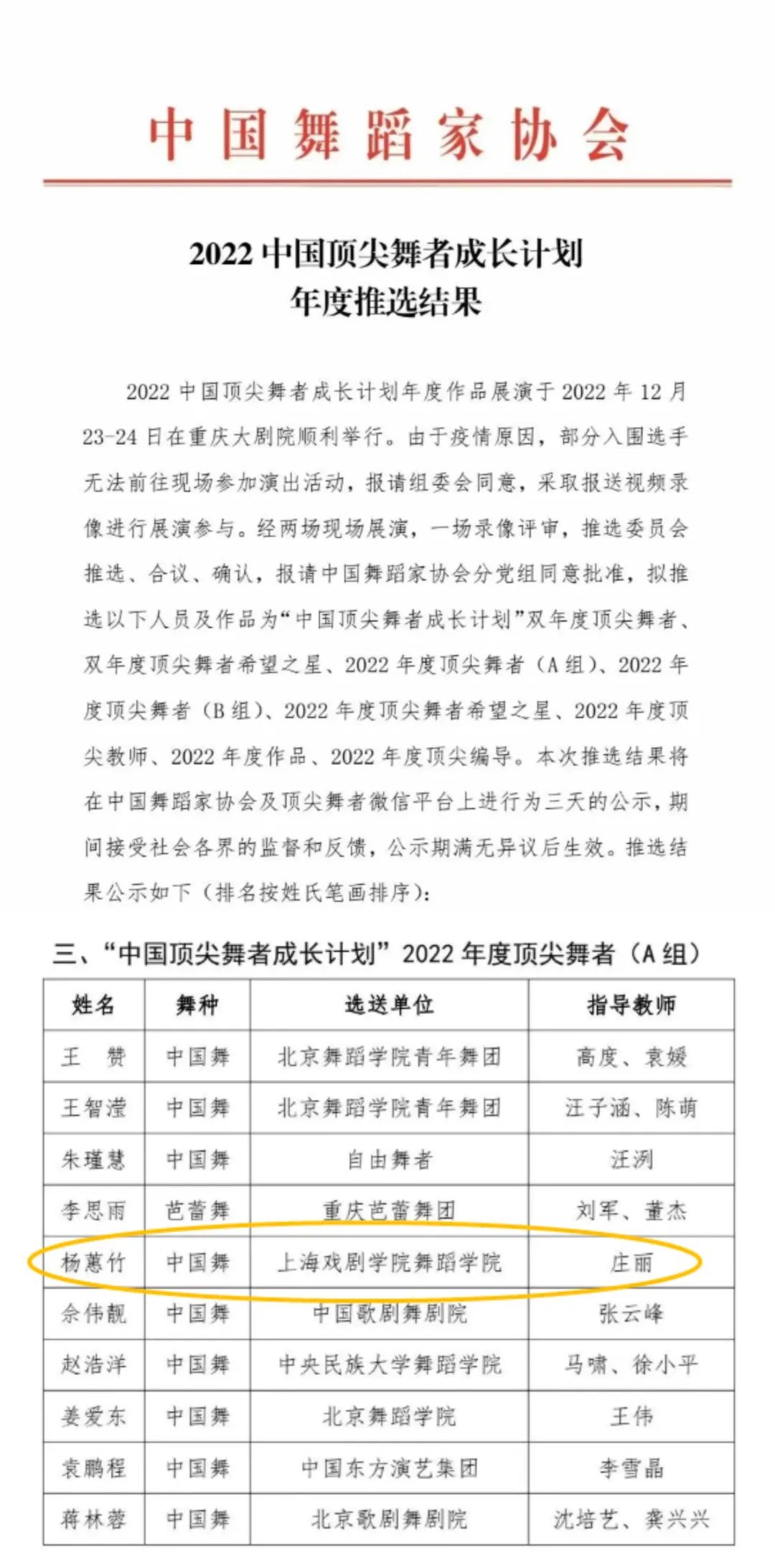 “中国顶尖舞者成长计划”是中国舞协深入贯彻落实习近平总书记关于文艺工作重要论述,为强化聚焦“做人的工作”而开办的舞蹈人才选拔、人才培育工程,于2021年首次推出。2022年,中国舞协继续充分发挥组织优势和专业优势,团结舞蹈界德艺双馨的优秀舞蹈艺术家,组织近百名专家教师,以顶尖理念打造人才梯队,以工匠精神打磨高峰作品而开展的“2022中国顶尖舞者成长计划”从未停歇脚步,经过视频报送评选、全国总推选、全国百强集训、年度作品展演等多个阶段的遴选,从全国近三千家院团院校及舞蹈培训机构选报的万余名选手中,选拔出优秀舞者角逐出“年度顶尖舞者”等奖项。除了杨蕙竹之外,舞蹈学院还有鲁玉涵、符育维、郑鑫、祝赫、彭晶晶入围了“顶尖舞者成长计划”全国百强!