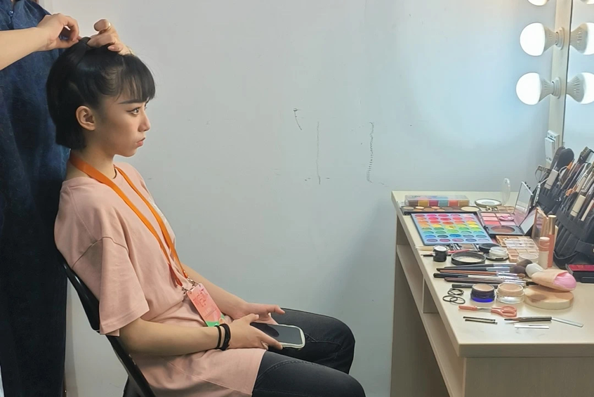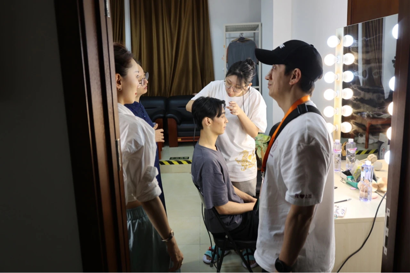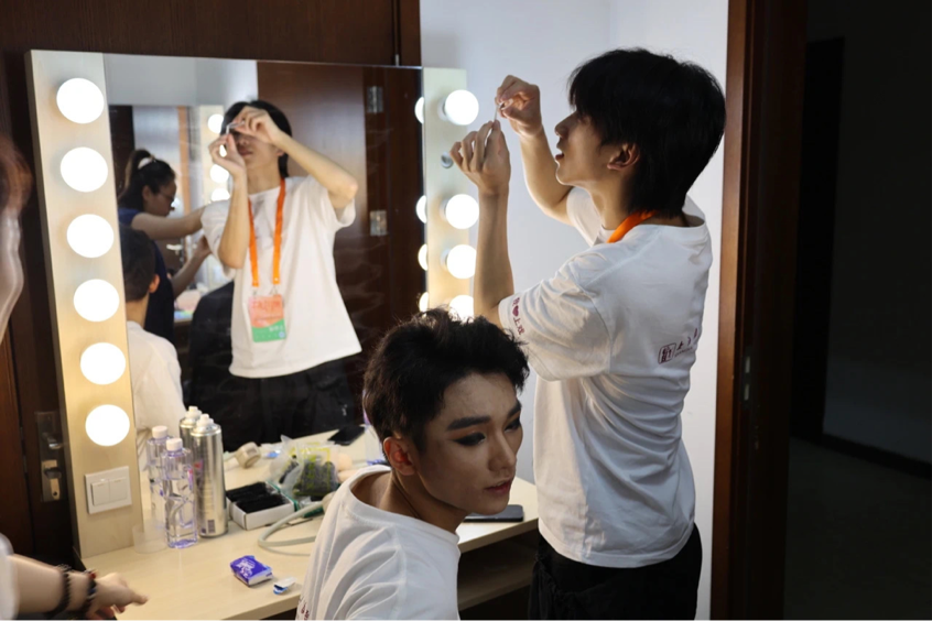 师生进入剧场,熟悉场地、合光、化妆,等候上场。