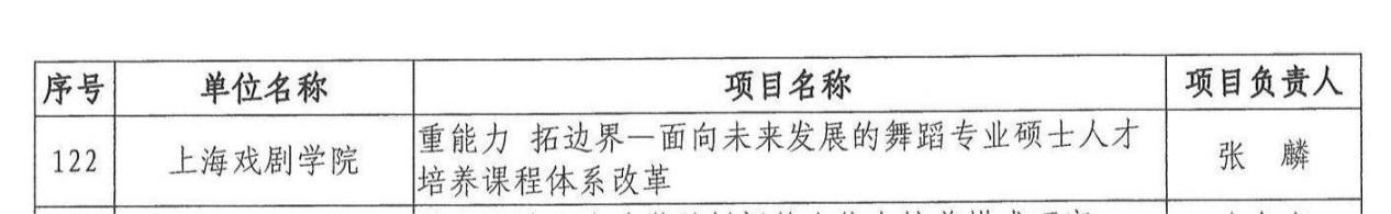 近日,上海市教育委员会 上海市学委员会发布了《关于2023年上海市研究生教育改革项目立项名单的通知》,其中由我院张麟教授领衔的《重能力 拓边界——面向未来发展的舞蹈专业硕士人才培养课程体系改革》获得立项。