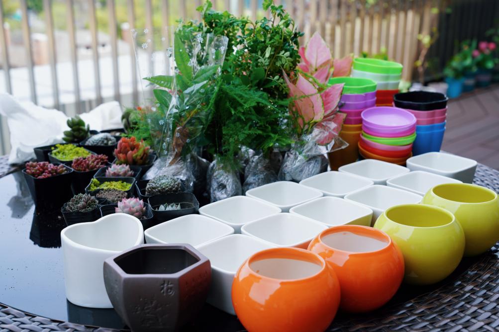 活动开始前,露台上的每一个角落都摆放着各式各样的花盆和绿植,它们静静地等待着新主人的到来。