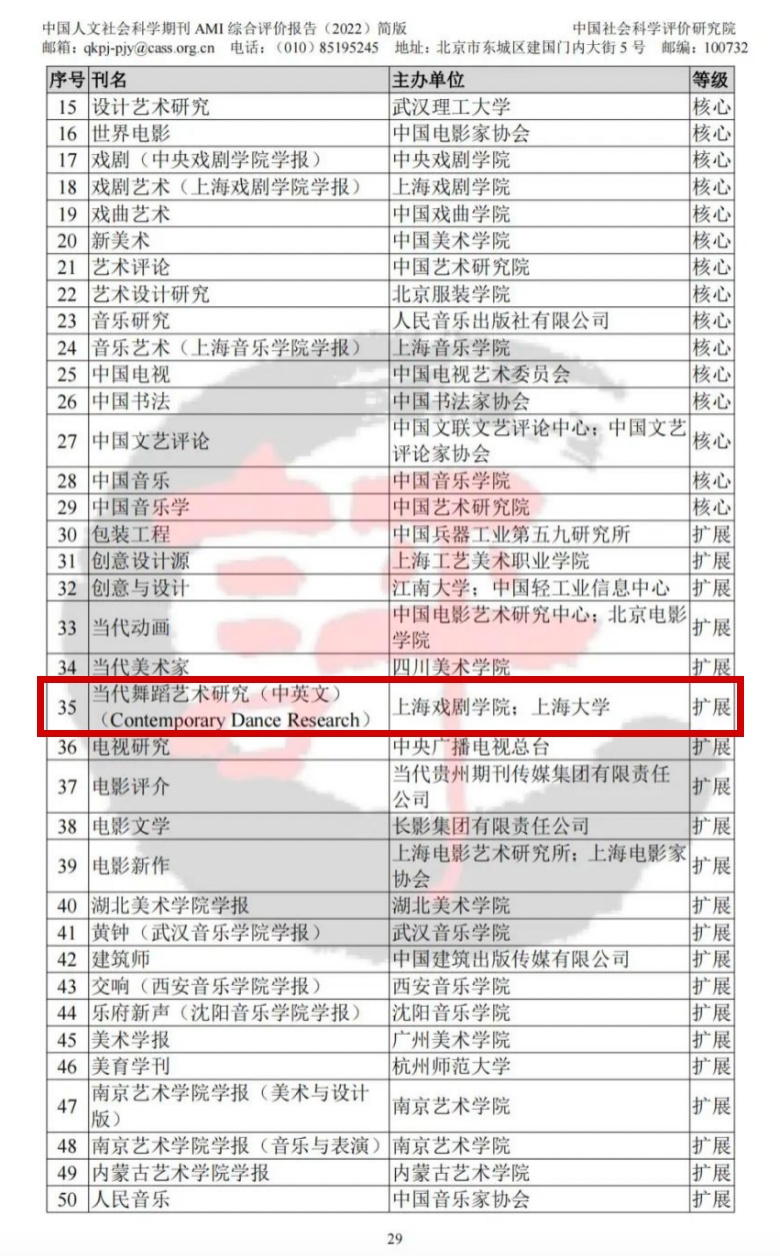 近日,在中国社会科学评价研究院(以下简称“评价院”)正式公布的《中国人文社会科学期刊AMI综合评价报告(2022)》中,《当代舞蹈艺术研究(中英文)》被评定为“2022年度中国人文社会科学期刊AMI综合评价” 扩展期刊,是艺术学中唯一的中英双语刊物。这代表着评价院以及学术界对本刊的认可与鼓励。在此,感谢所有支持、帮助本刊成长的专家学者以及广大作者和读者。