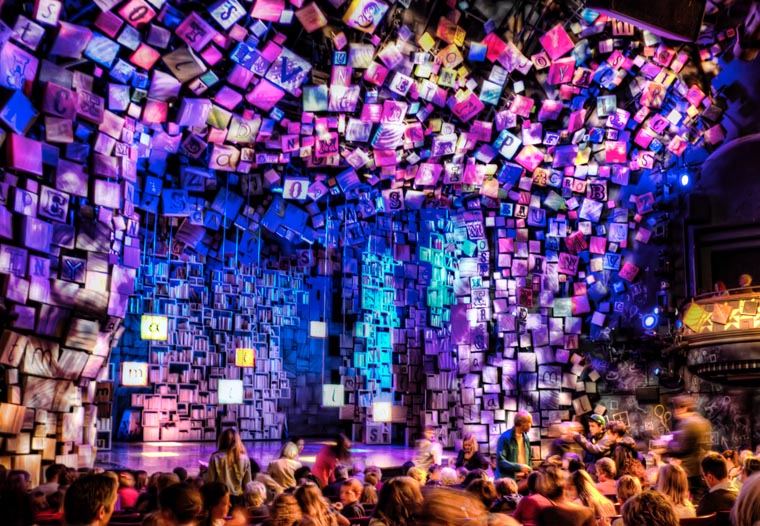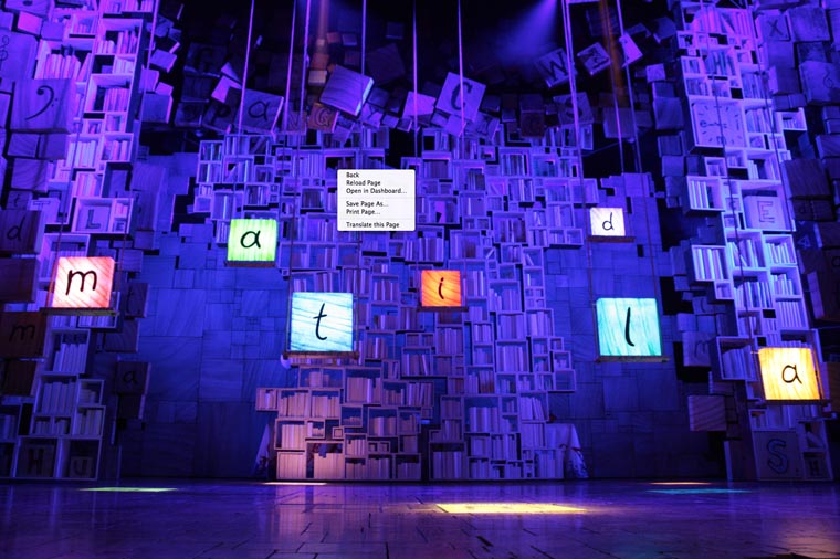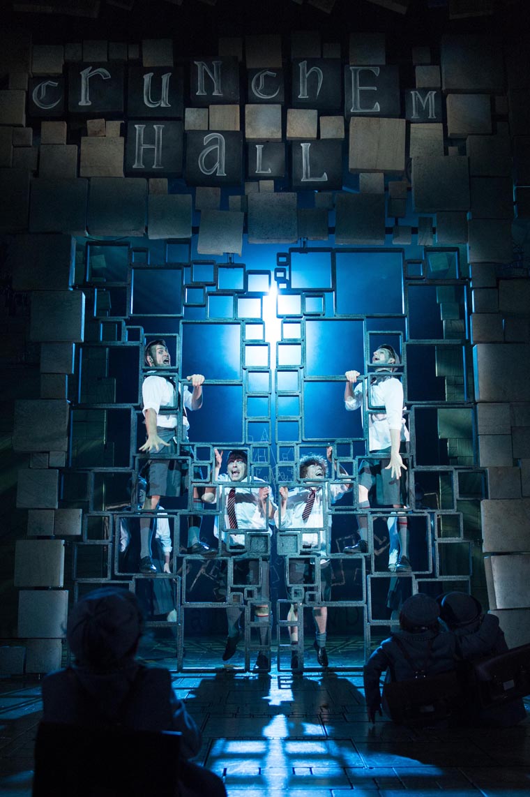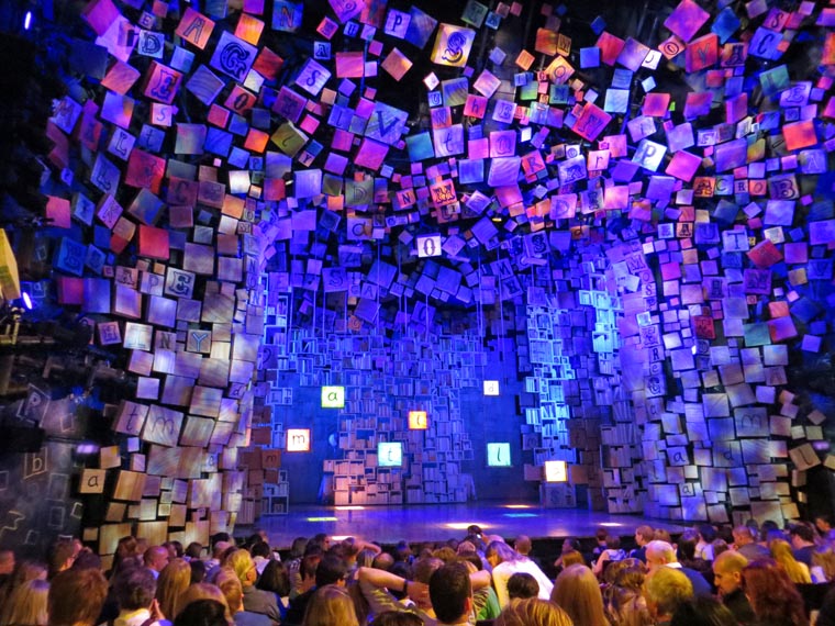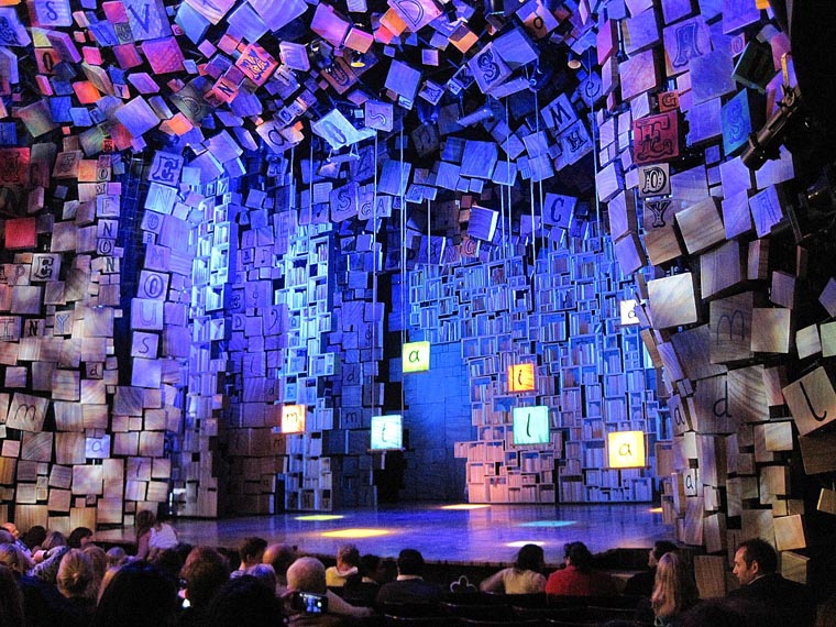 他主要讲的是小小的玛蒂尔达在五岁时就把大多数经典作家的作品读完了,不幸的是这个聪明绝顶的小姑娘却遇到了世界上最庸俗势利的爸爸妈妈和最恶毒的校长。但她自有对付这一切的办法,在和恶毒的特朗奇布尔校长斗争的过程中,玛蒂尔达和善良的亨尼小姐结下了深厚的友谊。我在已经有了很高的期待值的基础上,走进了剧场,结果是他的精彩程度还是远远超出了我的想象。首先是一走进剧场就映入眼帘的舞台,镜框和副舞台满满的被大大小小不同的木块包围了起来,在视觉上让人一下子就记住了立方体这个视觉元素,这个元素也是这出音乐剧舞台设计的视觉重点,在之后的布景里也在反复出现。随后,舞台上好像有无数个机关随着剧情的推动在等待着被观众和演员发掘,比如说小主人公会突然在舞台地板上不同的地方打开一扇小门,拿出自己收藏品,每一个小门散发出得光芒都是不同的,像极了童话里的场景。甚至为了营造紧张感,舞台镜框里竟然隐藏了几十盏激光灯,在校长女士搜捕的时候,这些激光等在观众席四处散射,让整个剧场仿佛置身于动作片中。而这个这正是我十分佩服百老汇音乐剧的一点,他们在演出之前会做好完全的准备,甚至会把剧场、舞台还有后台等等空间改造成最适合这出戏的演出的设置,也许,为了演出的一个小小的视觉效果,他们背后所付出的人力、物力还有财力都是巨大的,但也因此保证了演出的完美效果,《Matilda》也是如此。