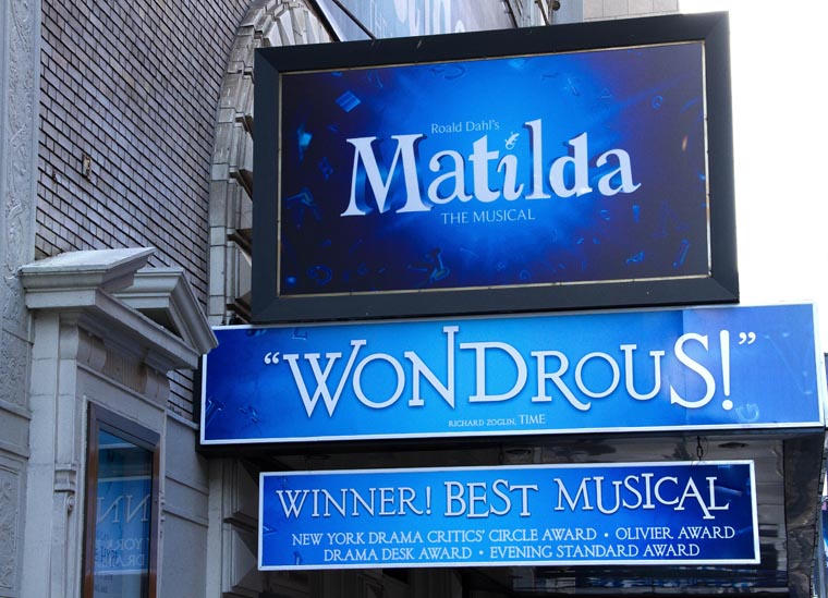 百老汇分为内百老汇(百老汇大街44街到53街)和外百老汇,能在内百老汇上演的剧目,一定都是经典、热门,商业的剧目,而在外百老汇上演的剧目一般都名气小、成本低、具有实验性。在纽约的十二天里,我们一共观看了六出音乐剧,有已经演出长达二十七年经久不休的《歌剧魅影》(The Phantom Of The Opera),也有刚刚上演一年根据电影《Once》改变的同名音乐剧等等,每一部都个性鲜明,制作精良。其中给我印象最深是《Matilda》,这一部音乐剧因为在英国的演出获得了巨大演出,因此被引进到美国百老汇,其中重要的演员都是伦敦原班人马,保证观众能看到原汁原味的英式的音乐剧。