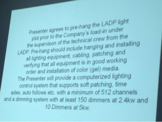 资料是来自国外知名团体和上海大剧院谈判时候提出的舞台技术要求,老师分享给我们,一一介绍各种技术要求的要点,舞台技术机械的快速发展,也产生了专业舞台技术人员的急缺。