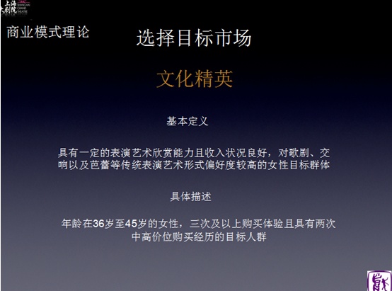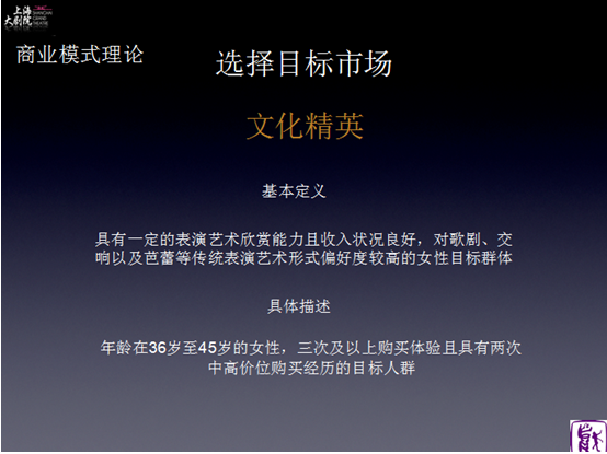 《剧院的商业模式》课程由上海大剧院客服部经理周澄宇讲授,分别从【商业模式画布】中VP“价值主张”;CR“客户关系管理”;CS“市场细分”三个主要方面着手介绍。大剧院是非盈利性、国家差额拨款机构,大剧院的运营是采用一种创新的商业模式,核心业务分别是演出项目+艺术教育,运营目标是可持续的良性发展,年度的盈余也将全部投入到新一个演出季的筹备中。