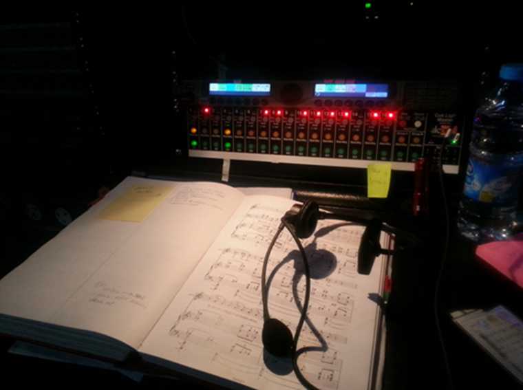 当一切事情都解决好,开始正式大彩排的时候,我的工作就轻松了很多,只需要在舞监旁边待着,看看她有没有什么小忙需要帮助的可以了。正式排练一开始舞监除了Call Q 之外就没有什么太大的事情需要我帮助解决了,我就在旁边默默的看着她和副舞监以及助理舞监一起工作。副舞监确保好演出所需要的一切道具和布景等等,助理舞监主要负责催场,而舞监Call Q。我本来以为舞监会像上次洛杉矶舞团的舞监一样看舞蹈或是情节Call Q,但是她却拿出了一大本厚厚的乐谱,看着乐谱和指挥的手势Call Q。对于我这样对音乐不是很了解的人来说,看着舞监用乐谱Call Q真的是充满了崇拜感。我仔细地观察了她的乐谱,每一张纸上都是印的单页,没有正反都印乐谱,左边是空白页,右边是乐谱。乐谱本是线圈本,所以翻动的时候比较方便,而且左边的空白页都可以拿来为右边的乐谱页做标记。舞监的右边乐谱页上有做一些小标记,然后用尺划条线,延到左边写下详细的Q内容。她也会用便利贴和铅笔配合音乐总监做一些Q的修改,修改的时候写的都非常清楚详细。我也一直听着她Call Q,她Call Q的声音我总是忘不了,她Call Q的时候非常温柔:“Stand by LightQ245… And LightQ245… Go! Thank you.”她每次Call 完一个Q都会跟大家说一声谢谢。若我是声音那一头的操作员,听到这样的Call Q我想我也会觉得非常的开心,工作起来也会更好。第一次排练结束后,她跟我说了抱歉,跟我解释说她演出之前比较的急躁,也对我表示了感激。之后的每一场演出,我都站在她旁边听她Call Q,学着她做舞监的样子。演出结束后我告诉她说,希望以后我也可以像她一样成为一个优秀的舞监。