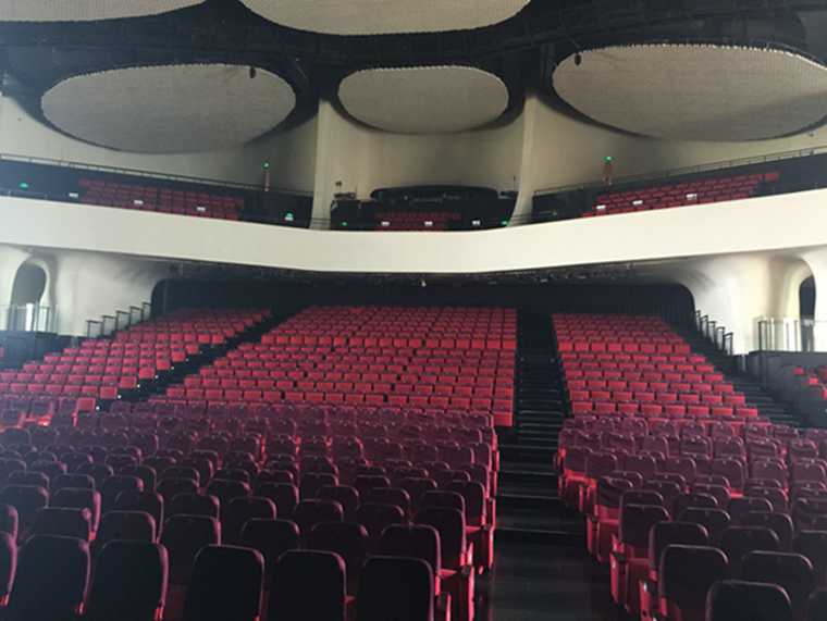 在参观舞台时,他们介绍了大观舞台的一大亮点,即可升降、可拆卸切换成舞台的前排观众席,这是不多见的配备,这样保证了舞台的对不同剧目的适应性。