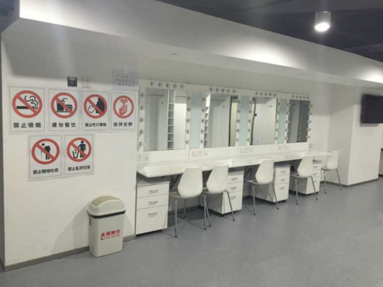 参观化妆间时我们发现大观舞台的化妆间与其他剧院有明显区别,这里的化妆间空间很大,整洁有序,这就一定程度上避免了后台的混乱。
