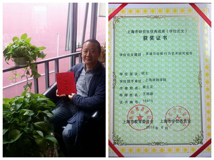 首先,2011级艺术学视觉艺术研究方向的MA毕业生崔立正的学位论文《系谱与症候:行为艺术研究报告》获得了上海市教育委员会及上海市学位委员会颁发的“上海市研究生优秀成果(学位论文)奖”,导师乃王邦雄教授。