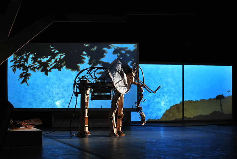 在这场戏里,跨学科的工作方式就显得十分有趣,尤其是那些纯手工制作的许多智能小机器。比如在这座大草原里,我们看到了蛇、乌龟、蟋蟀、鸟、公羊、蜗牛、象……它们有些使用金属与木头制作,眼睛却似乎能说话,不断地述说着那个失落的天堂。蜗牛,用一片丁字形的木须、两片圆形的透明有机玻璃,似乎就概括了它的全部身形,而有趣的是,肉身的血脉则由一个集成电路板所替代。大象的生理结构,在戏里被转化为木质手工制作的雕塑,极大地创新了大象的情感与行为方式,若是被拆除,它的身上将会散落下无数的零件。阿密特•卓瑞就是如此钟爱着这种类似于偶戏的创造,这一兴趣从他在耶路撒冷视觉戏剧学院(The School of Visual Theatre )学习时便已生发。他说:“小时候,我常常弹奏吉他,并且想成为一名音乐家。大学里,我学习并涉猎了很多领域,很快便对戏剧着了迷,尤其为木偶戏痴迷。”
