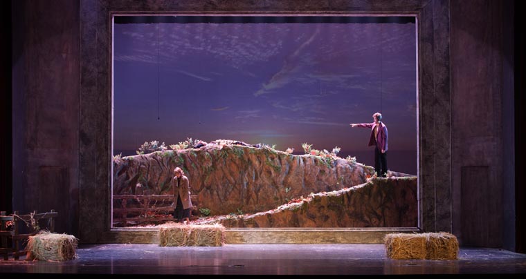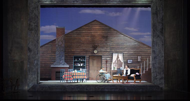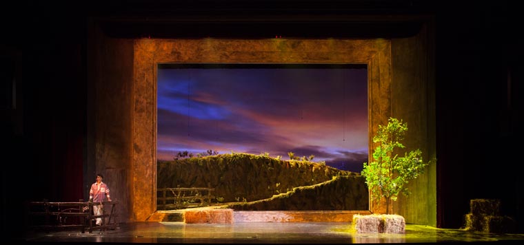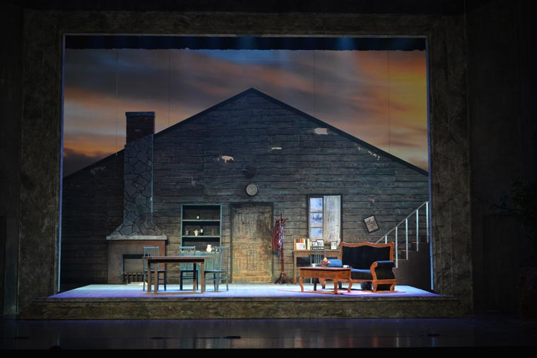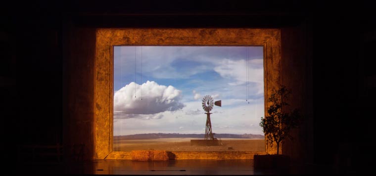 “天边外”这一词语给我们的设计灵感就是宛如一幅优美的画境。想画好一幅优美的画不容易,要在舞台上表现一幅带有空间概念的画就更难了。该剧本所讲述的是两个兄弟因为一个女人所带来的不一样的人生,一次错误的选择所带来的悲剧。在王履伟老师的提点下,我们以画框为设计元素,让主人公在画框里演绎自己的人生,剧本分三幕,每幕两场,一个在室外,另一个在室内。室外的场景强调天边外的神秘,室内强调岁月的变迁。在这两个场景的变化当中,画框将两个不同的场景有机的结合起来。设计的基调都是以写实为主,为了体现画面的感觉,我们有意将演区压缩在离台口4米左右,并且也将台口利用起来,使演区贴近观众。室内场景我们设计了一个装有滑轮的平台,将平台伸出画框1米多的距离,以此来体现现实与梦想之间的差距。演员在室外的戏中,从画中的山坡里走出来,这种现实与梦想的交错也是我们想表达的情感。这次的设计当中还充分运用了多媒体投影,一个正面投射,一个背面投射。多媒体使画中的布景动了起来,流动的白云,星空,日出,恰好表现了时间的流逝,体现了不同时节不一样的气氛。这次的绘景工作,由于是写实的风格而且景片数量多,体积大,因此绘景工作持续了8天。每个景片,每个道具都注入我们的心血,力求达到最写实的效果。